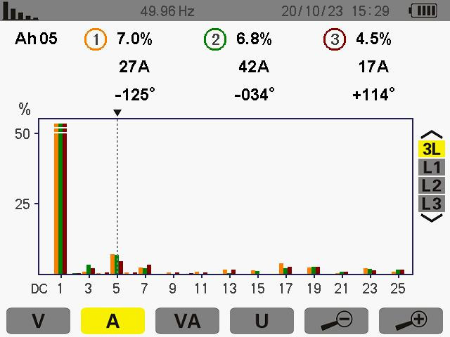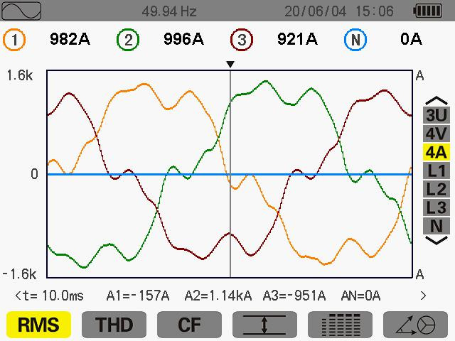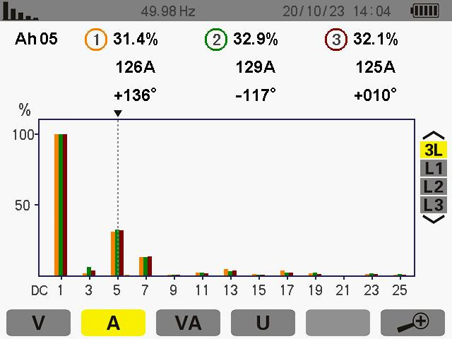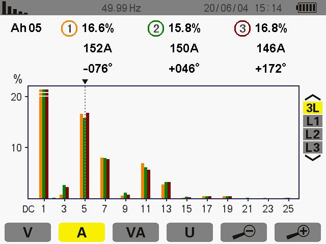 此次測量為5次諧波其ABC的THD值為 16.9% 16.8% 17.4%諧波電流為 156A 156A 151A。
