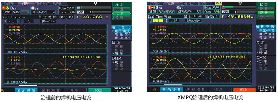 加裝XMPQAPF后,對(duì)電流諧波以及無(wú)功進(jìn)行治理,效果對(duì)比如下,三相電流不平衡基本消失,中線電流基本為零,電壓電流諧波基本消失,THDi降低到2.7%,功率因數(shù)提高到0.980。